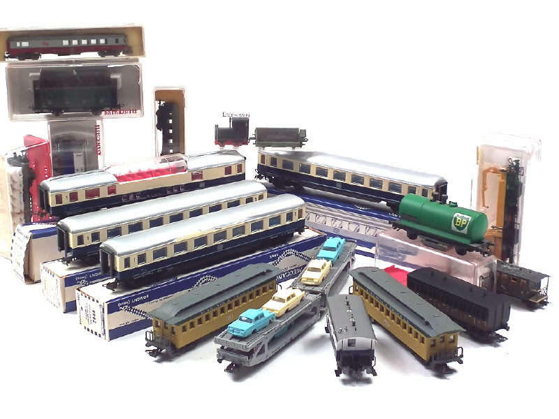 différentes échelles - comprend : 12 voitures de voyageurs, 5 wagons, une machine de réparation de voies & une motrice (non testée) - on y retrouve notamment les marques : FLEISCHMANN, JOUEF, HORNBY, LILIPUT & LIMA - quelques petits manques - certaines boîtes incomplètes