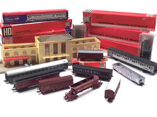 états de 'A' à 'D' - comprend : motrice, 10 voitures de voyageurs, 7 wagons de marchandises, une boîte de 4 containers & une gare - on y retrouve les marques : JOUEF, RIVAROSSI, ROCO, LIMA, LILIPUT, HORNBY, R-G & FLEISCHMANN - 6 modèles avec boîte - on y joint 4 boîtes vides de la marque JOUEF