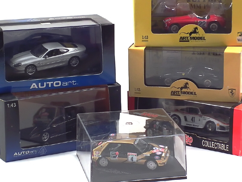comprend : ASTON MARTIN DB 7, LAMBORGHINI MURCIELAGO (boîte en état 'c'), KREMER K 3, LANCIA DELTA (avec certificat d'édition limitée numéroté 1455/3000 exemplaires) & FERRARI 166 (2 exemplaires différents) - on y retrouve les marques : AUTOART, QUARTZO, ARTMODEL & SKUD