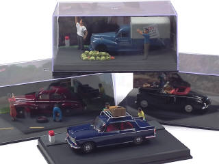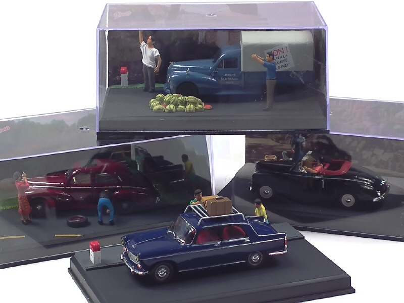 collection 'LA ROUTE BLEUE' - comprend : 203 cabriolet, berline, pick-up bâché & 404 - avec dioramas, figurines & accessoires