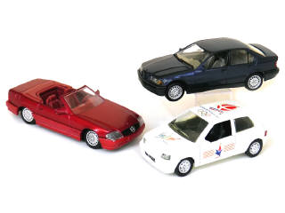 miniatures reproduisant les modèles : MERCEDES 500SL roadster, BMW 318 & RENAULT CLIO J.O. ALBERTVILLE 1992 (manque l'essuie-glace arrière)