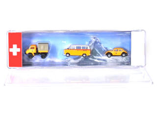 échelle HO - comprend : VOLKSWAGEN COCCINELLE, FORD TRANSIT, MERCEDES UNIMOG - coffret promotionnel pour les postes suisses