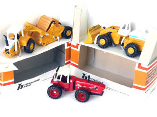 miniatures reproduisant les modèles : INTERNATIONAL 560 PAYLOADER chargeuse articulée, INTERNATIONAL 412B scraper & INTERNATIONAL 3588 tracteur agricole (sans boîte)