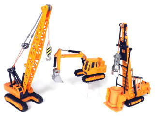 états de 'A' à 'B' - miniatures reproduisant les modèles : HITACHI grue sur chenilles, HITACHI UH04 pelle rétro sur chenilles & KATO 30 THC foreuse