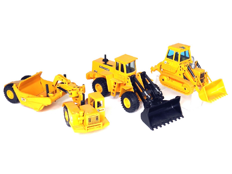 miniatures reproduisant les modèles : VOLVO BM L160 chargeuse articulée, CATERPILLAR 955L chargeuse sur chenilles & CATERPILLAR 6310 dumper - modèles légèrement poussiéreux