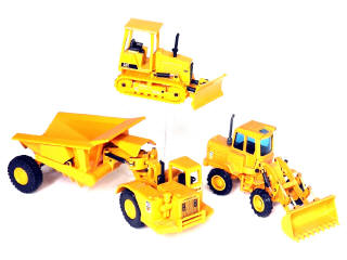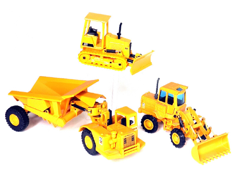 miniatures reproduisant les modèles : 920 chargeuse articulée, D5C bulldozer & 631D dumper - modèles légèrement poussiéreux