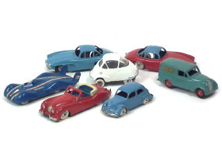 états de 'C' à 'R' - comprend : MERCEDES 300 SL (2 exemplaires différents dont un avec important manque de peinture sur le coffre), JAGUAR XK 140, ISETTA VELAM (plancher dériveté), RENAULT DAUPHINOISE 'POSTES' (avec éclats majeurs), ETOILE FILANTE & PANHARD DYNA X - on y retrouve les marques : QUIRALU & C.I.J - quelques pneus séchés