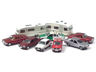 comprend : MERCEDES 350 SE (2 exemplaires identiques), 190, VOLKSWAGEN GOLF 'AVD', OPEL CORSA, ASCONA, REKORD 'POLIZEI', HYMER MOBIL & TABERT SENATOR (en état 'B' - un éclat sur le toit)
