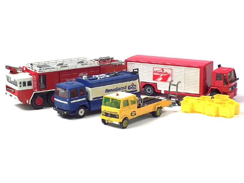 comprend : METZ FAUN pompiers, MAN 8 citerne ARAL, FORD fourgon 'LIMONADE' (avec 11 accessoires) & MERCEDES dépannage ADAC
