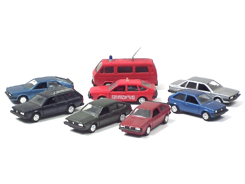 comprend : AUDI coupé 5 S, VOLKSWAGEN POLO coupé, SCIROCCO GLI, SANTANA GL, PASSAT GLS (2 exemplaires différents, dont avec traces de colle sur le toit), VARIANT GLS & transporteur d'intervention