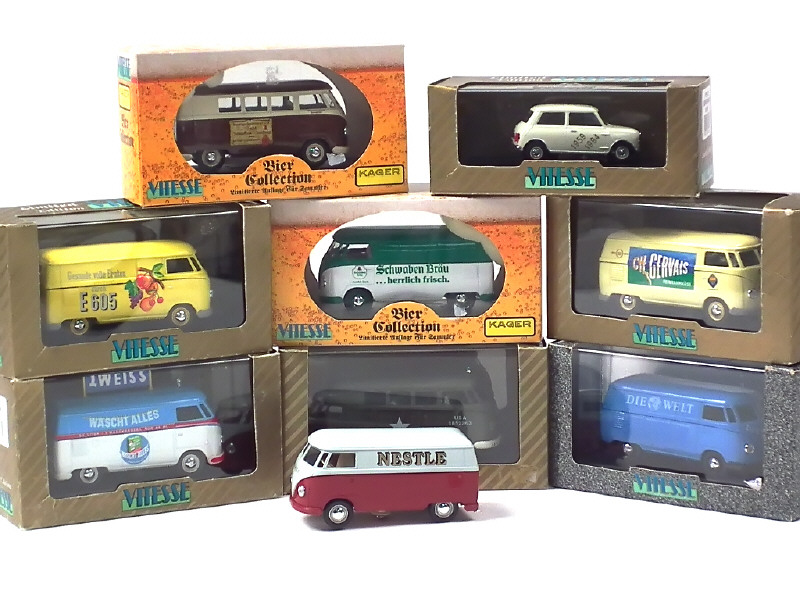 comprend : BULLI (6 exemplaires différents tôlés dont 2 à tirages limités) & KOMBI (2 exemplaires différents vitrés) - on y joint une MORRIS MINI MINOR 1959-94 '35EME ANNIVERSAIRE DE LA MINI' - tirages limités