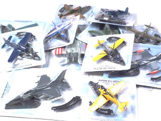 réalisation en métal - échelle 1/100ème - modèles vendus en kiosque - miniatures reproduisant notamment les modèles : ALFA JET, F6D MUSTANG, P40C TOMAWHAK, F15 EAGLE & CORSAIR F4 U1