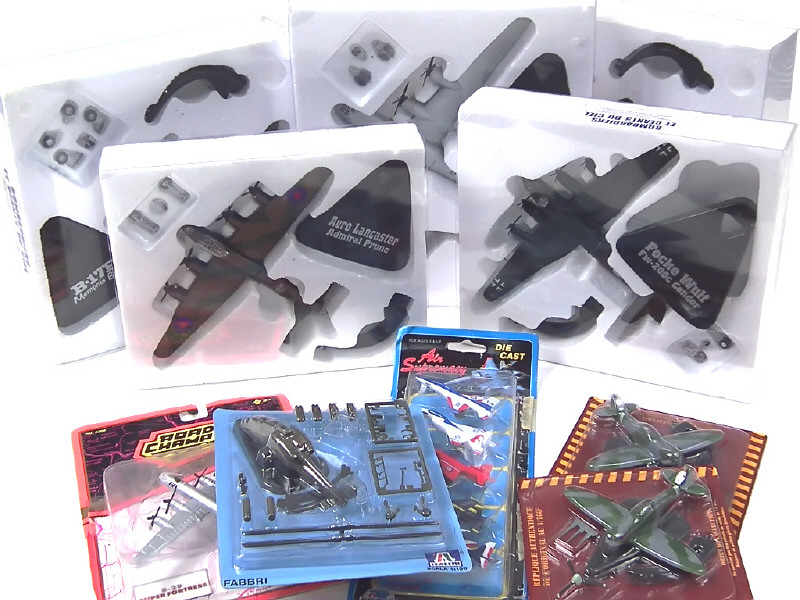 différentes échelles - comprend notamment : AVRO LANCASTER, FOCKE WULF, B17 MENPHIS BELL (2 exemplaires identiques) & B29 SUPER FORTRESS - 5 avions regroupés sous blister (en état 'c') - un modèle à monter - on y retrouve notamment les marques : EDITIONS ATLAS, ROADCHAMPS, PLAY POWER & ITALERI (distribué par les éditions FABRI)