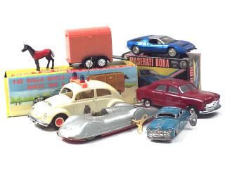 états de 'B' à 'D' - comprend notamment : VOLKSWAGEN COCCINELLE 'BRIGADA DE TRANSITO' (moteur à friction fonctionne), MASERATI BORA (échelle 1/28ème - boîte en état 'c'), AUTO-UNION voiture de records (moteur à clef fonctionne avec système de pierre à briquet - avec clef), berline américaine (longueur : 18 cm - moteur à ressort à revoir), berline en tôle lithographiée (longueur : 14 cm - moteur à clef fonctionne - avec clef) & van à chevaux (avec un cheval - boîte en état 'b') - on y retrouve notamment les marques : PEPE, EIDAIGRIP, TIPPCO & OK