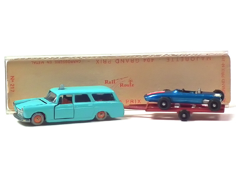 MAJORETTE (FRANCE) 217 PEUGEOT 404 Break avec Formule 1 sur remorque 2 tons de bleu & rouge