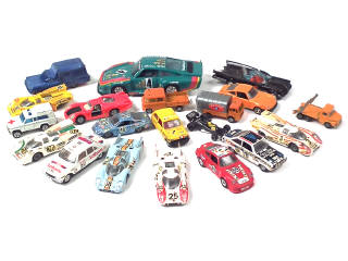 états de 'C' à 'R' - échelles différentes - miniatures reproduisant les modèles : PORSCHE, ALFA ROMEO, MERCEDES, RENAULT, PEUGEOT, CHEVROLET, BATMOBILE & ALPINE - on y retrouve les marques : CORGI TOYS, SOLIDO, CHAMPION, DINKY TOYS GB, BBURAGO & MAJORETTE - avec manques