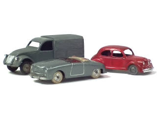 comprend : CITROEN 2CV fourgonnette (état 'E', avec détails de peinture ajoutés), PANHARD DYNA JUNIOR (état 'D', manque capote, pare-brise déformé) & DYNA X (état 'R') - on y retrouve les marques : CIJ & JRD