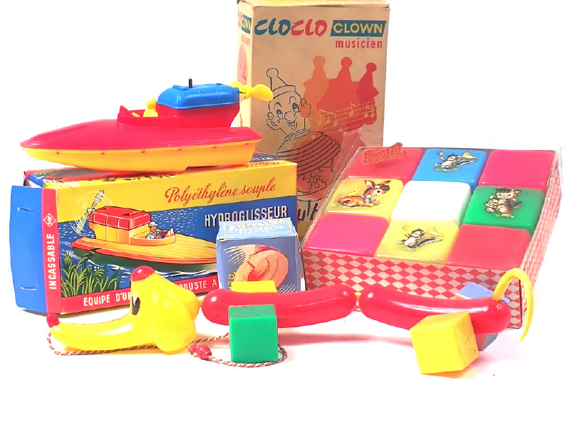 réalisations en plastique - comprend : une toupie, un chien (jouet à traîner), un culbuto, un hydroglisseur & un jeu de cubes - on y retrouve les marques : MGM, ROYAL FB & SOP - quelques petites déchirures sur les boîtes