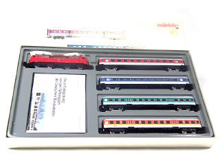 non testée - contient : motrice électrique 111 068-3, 3 voitures mixtes de première & 2ème classe, voiture de voyageurs de 2ème classe, notices, planche de décalques, bon de garantie & dépliant de présentation des nouveaux produits de la DEUTSCHE BUNDESBAHN - boîte légèrement décolorée