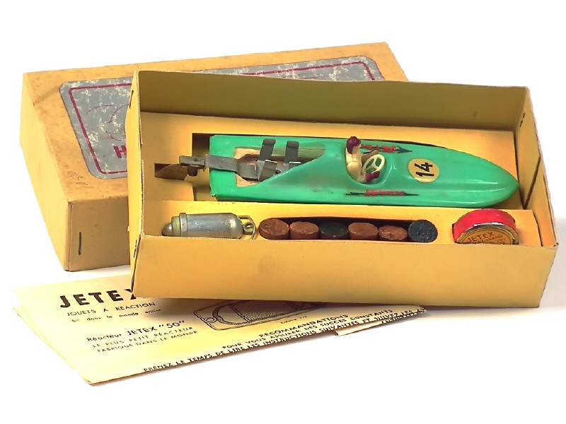 coffret contenant le bateau, le réacteur, 6 pastilles de poudre & une boîte de mèches d'allumage - n'a jamais été utilisé - avec sa notice - carrosserie légèrement déformée & encrassée