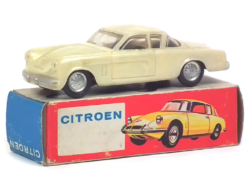 longueur 15 cm - moteur à friction (fonctionne) - quelques petites fêlures à l'intérieur des jantes - volant désolidarisé - malgrè l'illustration de boîte (CITROEN DS), celle-ci est conforme au modèle (erreur d'usine)