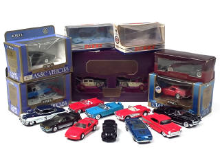miniatures reproduisant notamment les modèles : FORD, FERRARI, PONTIAC, CHEVROLET, CADILLAC, VOLKSWAGEN - on y retrouve notamment les marques : ERTL, LLEDO, VITESSE, DINKY MATCHBOX, REXTOYS & FRANKLIN MINT - 6 modèles (avec boîte en état 'c') dont 2 regroupés dans un coffret - on y joint 2 boîtes vides de la marque DINKY MATCHBOX (en état 'B.c') - petits manques