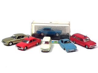 états de 'A' à 'B' - comprend : PEUGEOT 504 coupé (avec boîte en état 'b'), berline & break de pompiers, CITROEN SM, AMI 6 & MERCEDES 300 SL (modèle original en état 'E') - on y retrouve les marques : SOLIDO, VEREM & QUIRALU