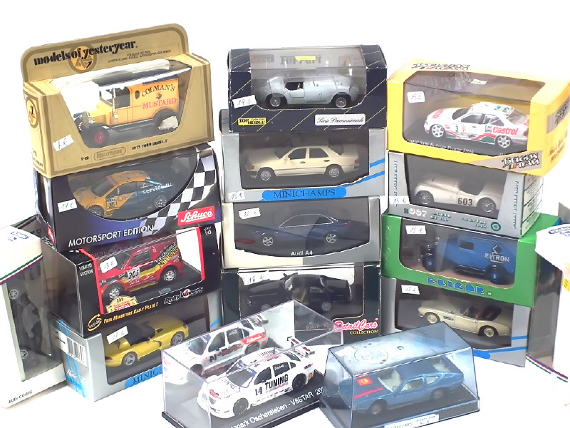 on y retrouve notamment les marques : SCHUCO, MINICHAMPS, ELIGOR, RIO, DETAIL CARS, SKID, MATCHBOX, NZG, BRUMM, IXO & NACORAL - possibilité de petits manques - quelques boîtes en état 'c'