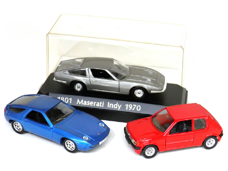 miniatures reproduisant les modèles : PEUGEOT 205 (détails de peinture ajoutés), PORSCHE 928 (détails de peinture ajoutés) & MASERATI INDY (manque un dossier de siège, avec boîte état 'a')