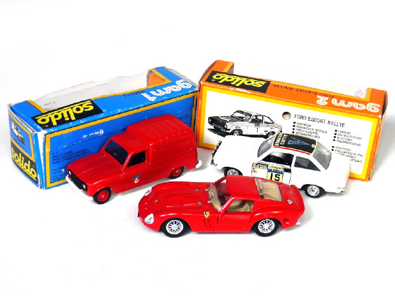 états de 'A' à 'B' - miniatures reproduisant les modèles : FERRARI 250 GTO (manque un morceau de lunette arrière), RENAULT 4 fourgonnette (manque un morceau de pare-chocs & de jupe arrière) & FORD ESCORT (manque planche de décalques) - présence de 2 boîtes état 'b'