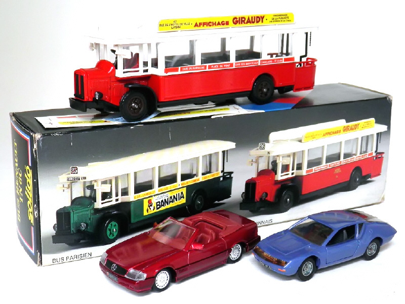 miniatures reproduisant les modèles : RENAULT TN6C autobus Lyon (un panonceau recollé, avec planches de décalques, notice & boîte état 'b'), ALPINE A310 (détails de peinture ajoutés) & MERCEDES 500SL roadster (décalques de plaques ajoutés)