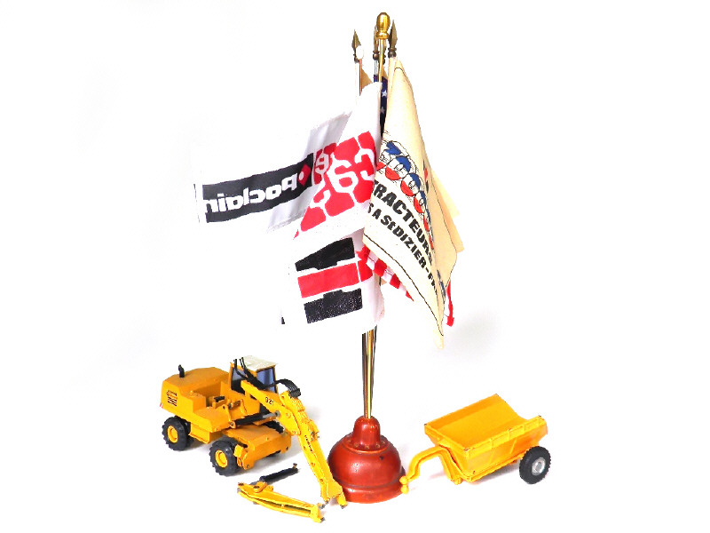 comprend : GESCHA LIEBHERR 921 (état 'F'), JOAL une remorque (état 'C') & porte fanions en bois (état 'B') : IH, IH CASE, POCLAIN CASE & divers