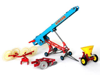 comprend : une charrue à soc, une ensileuse VICON, un élévateur LISTER (jantes partiellement fondues) & une faneuse - modèles poussiéreux