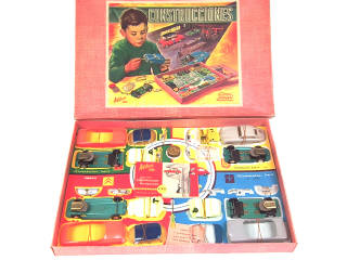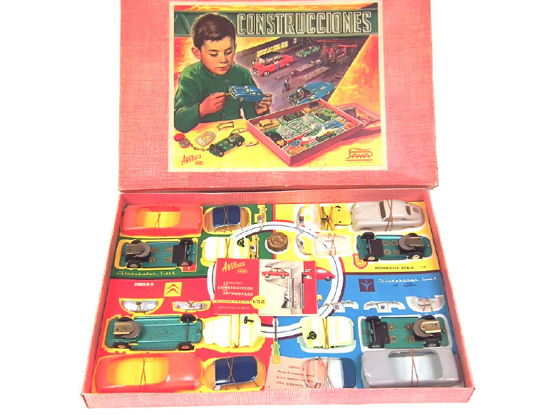 échelle 1/32ème - dimensions : 51,5 x 35 cm - contient carrosseries de : STUDEBAKER LARK (2 exemplaires dont un coupé & un cabriolet), CITROEN DS 19, PORSCHE 356 A, 4 châssis avec moteurs à friction, 4 aménagements intérieurs, vitrages, pare-chocs, boîte de visseries & tournevis - quelques manques de pellicule chromées par endroits - ensemble maintenu d'origine sur carton de présentation illustré avec dénomination de chaque véhicule & sa référence - quelques petits accrocs sur la boîte - avec catalogue présentant les différents modèles de la gamme avec leurs caractéristiques techniques - SUPERBE ENSEMBLE DANS UN ETAT EXCEPTIONNEL !