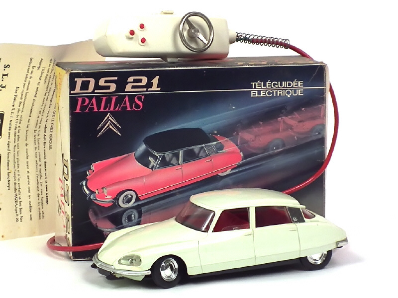 longueur 24 cm - moteur à piles (à revoir) - avec direction - notice présente - 2 petites fêlures sur le pare-brise - avec rare version de boîte 'DS 21 PALLAS'