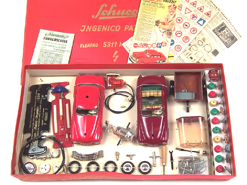 dimensions : 55 x 31 cm - contient : 2 carrosseries avec aménagement intérieur (découvrable & coupé), un châssis, un plancher, une calandre, un pare-chocs arrière, roues, pneus, jantes, une remorque à un essieu, un boîtier de piles, un moteur électrique, une commande à distance, 10 panneaux de gymkhana avec socle, des outils, accessoires & fixations diverses - semble complet sur socle de présentation avec élastique de maintien - avec 3 notices & bon de garantie - importantes traces d'humidité sur la boîte par endroits - SUPERBE !