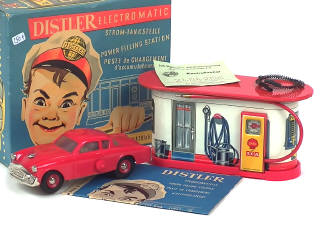 dimensions : 17,5 x 15 cm - contient : poste de ravitaillement en tôle lithographiée, STUDEBAKER COMMANDER en tôle & plastique (moteur à piles non testé), accessoire, cale de boîte, notice & bon de contrôle - SUPERBE !