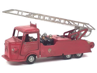 longueur 50 cm - moteur à clef (fonctionne) - modèle proche de l'état 'C' - avec direction, phares électriques (non testés, manque une ampoule), 2 dévidoirs, 5 pompiers & une pioche - manque pelle - pneus séchés & plus ou moins endommagés - quelques traces d'oxydation par endroits