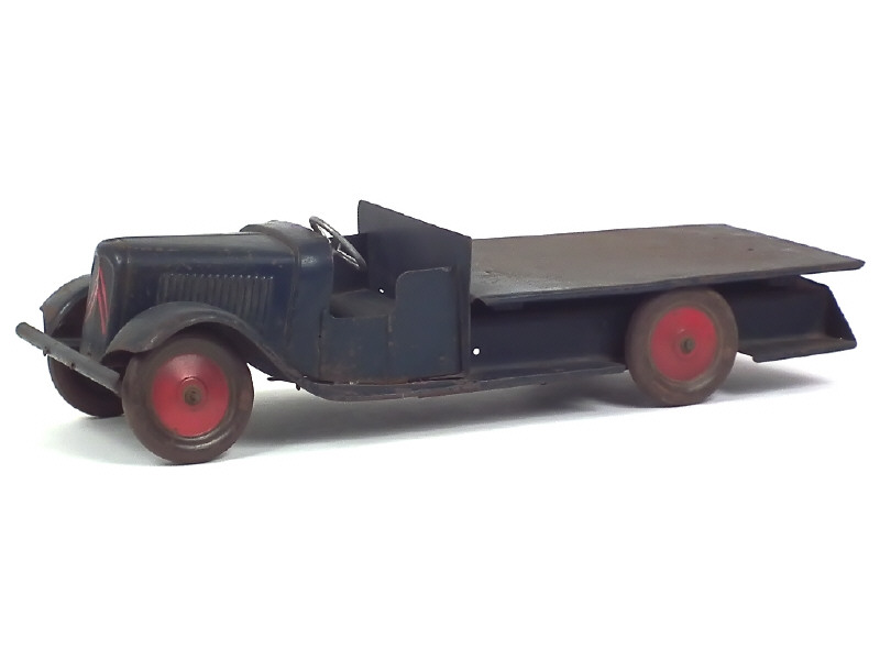 longueur 47 cm - fabrication de 1937-1939 - version économique sans phares, avec ailes agrafées en 2 parties, 3 roues en tôle & une en bois d'origine à l'arrière avec bande de roulement en cordelette (manquante) - moteur à clef (à revoir) - avec direction par le volant (non d'origine) - sans chargement