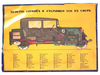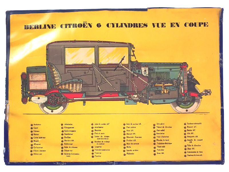 dimensions : 45 x 32.5 cm - représente une berline CITROEN 6 cylindres vue en coupe - manque système électrique permettant l'utilisation de ce jeu - planche gondolée avec quelques petits manques de papier sur le pourtour (avec ruban adhésif non d'origine collé)
