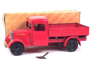 longueur 42 cm - version sans phare - moteur à clef (fonctionne) - avec direction par le volant & clef - mentions 'CAMIONNAGE' sur le fronton de la cabine, 'RENAULT' de part & d'autre du capot & 'TD' sur l'aile avant gauche - très légères traces d'oxydation par endroits - boîte déformée, décolorée avec couvercle manquant