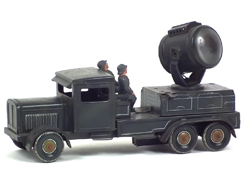 longueur 24,5 cm - moteur à clef (fonctionne) - avec direction - projecteur électrique (non testé) - avec 2 soldats en état 'B' dont un légèrement craquelé - un éclat majeur avec traces d'oxydation à l'arrière droit de la carrosserie
