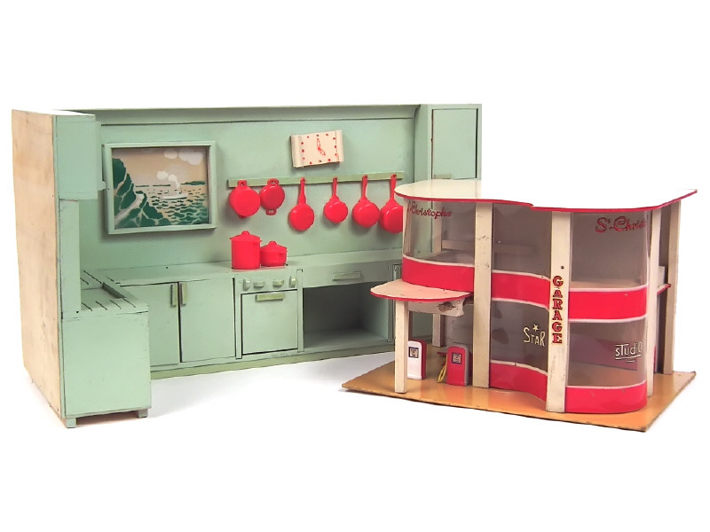 dimensions 34 x 25 x 22 cm - avec 2 pompes à essence, un pont élévateur & un monte-charge - avec éclairage électrique (non testé) - on y joint une cuisine en bois - dimensions : 61 x 25 x 32,5 cm en état 'B' avec 8 ustensiles de cuisine