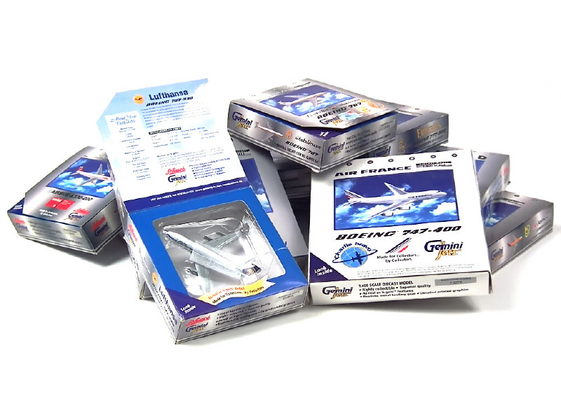 série 'GEMINI JETS' - échelle 1/400ème - miniatures reproduisant les modèles : BOEING 707 'EGYPT AIR', 707-330 'LUFTANZA', 747-400 'AIR FRANCE', 777-200 'EL AL', 'AIRLINES', 777-300 'EMIRATES', AIRBUS A330-200 'SWISS', A340-300 'AIR JAMAICA' (boîte en état 'c'), 'AIR TAHITI NUI', Mc DONNEL DOUGLAS 11 'VARIG' & 'LTU' - 8 exemplaires en édition limitée