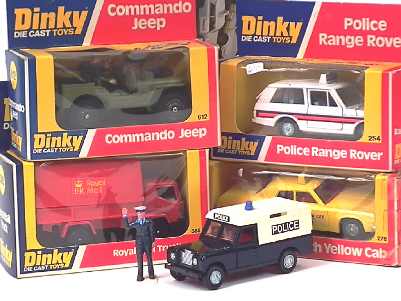 comprend : RANGE ROVER 'POLICE' ('C.c'), LAND ROVER 'POLICE', PLYMOUTH 'YELLOW CAB' (boîte en état 'c'), camion fourgon bâché 'ROYAL MAIL' (boîte en état 'a') & JEEP COMMANDO (blister de boîte déchiré)