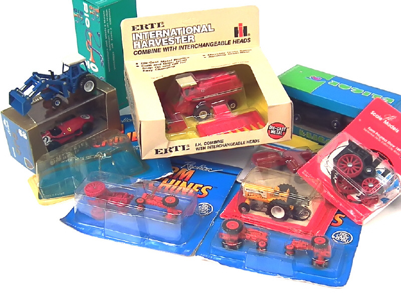 miniatures reproduisant notamment les modèles : FARMALL, CASE, INTERNATIONAL HARVESTER, NEW HOLLAND, FERRARI, ROLLS ROYCE & LINCOLN - on y retrouve notamment les marques : ERTL, BRUMM, RIO & ELIGOR - 4 boîtes en état 'c'