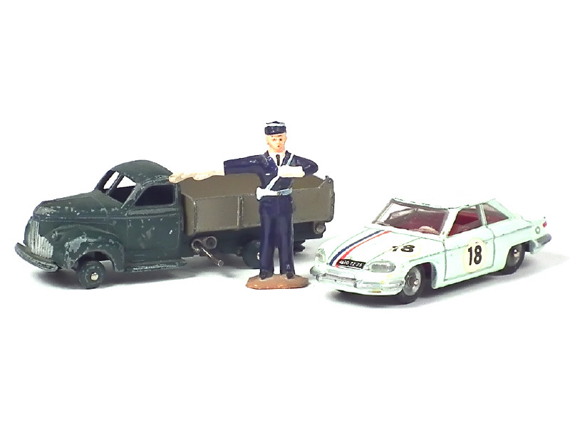 comprend : STUDEBAKER benne-basculante (en état 'E.o') & PANHARD 24 CT (en état 'C' - détails & décalques ajoutés) - on y joint un agent de circulation en plastique