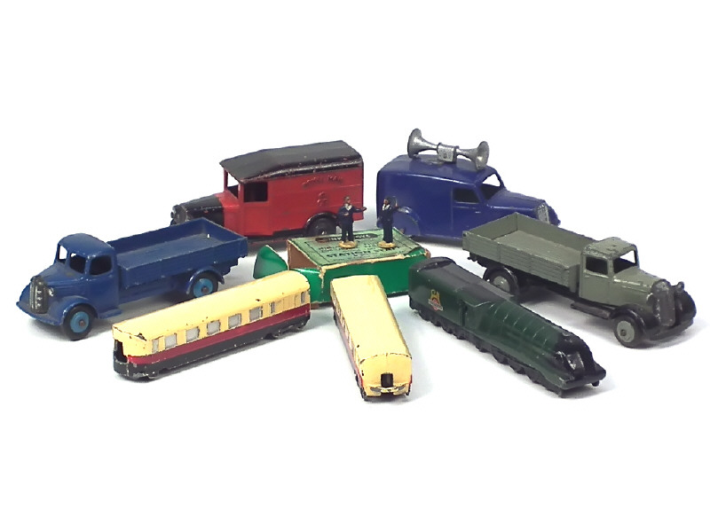 comprend : fourgonnette ROYAL MAIL, van avec haut-parleurs (fixations cassées), AUSTIN plateau à ridelles, camion plateau basculant & locomotive à vapeur avec 2 voitures 'BRITISH RAILWAYS' (en état 'D') - on y joint une boîte référence 051 de 6 personnels de gare de la marque ('C.d') - quelques petits manques