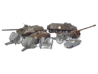 états de 'B' à 'D'- comprend : 2 blindés soviétiques, char SU100, ALFA ROMEO GIUILIA, 2 canons de 75 mm & un canon lourd soviétique - on y joint 2 remorques à munitions - on y retrouve notamment la marque : SR - avec manques & parties cassées