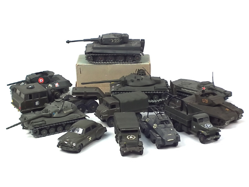 miniatures reproduisant notamment les modèles : TIGRE, CHEVROLET, BUSSING, AMX, BERLIET, SOMUA (détails de peinture ajoutés), SIMCA & SHERMAN - carrosseries encrassées - avec manques